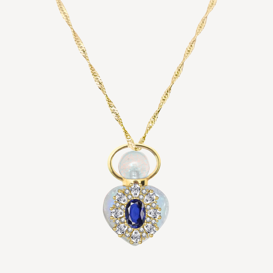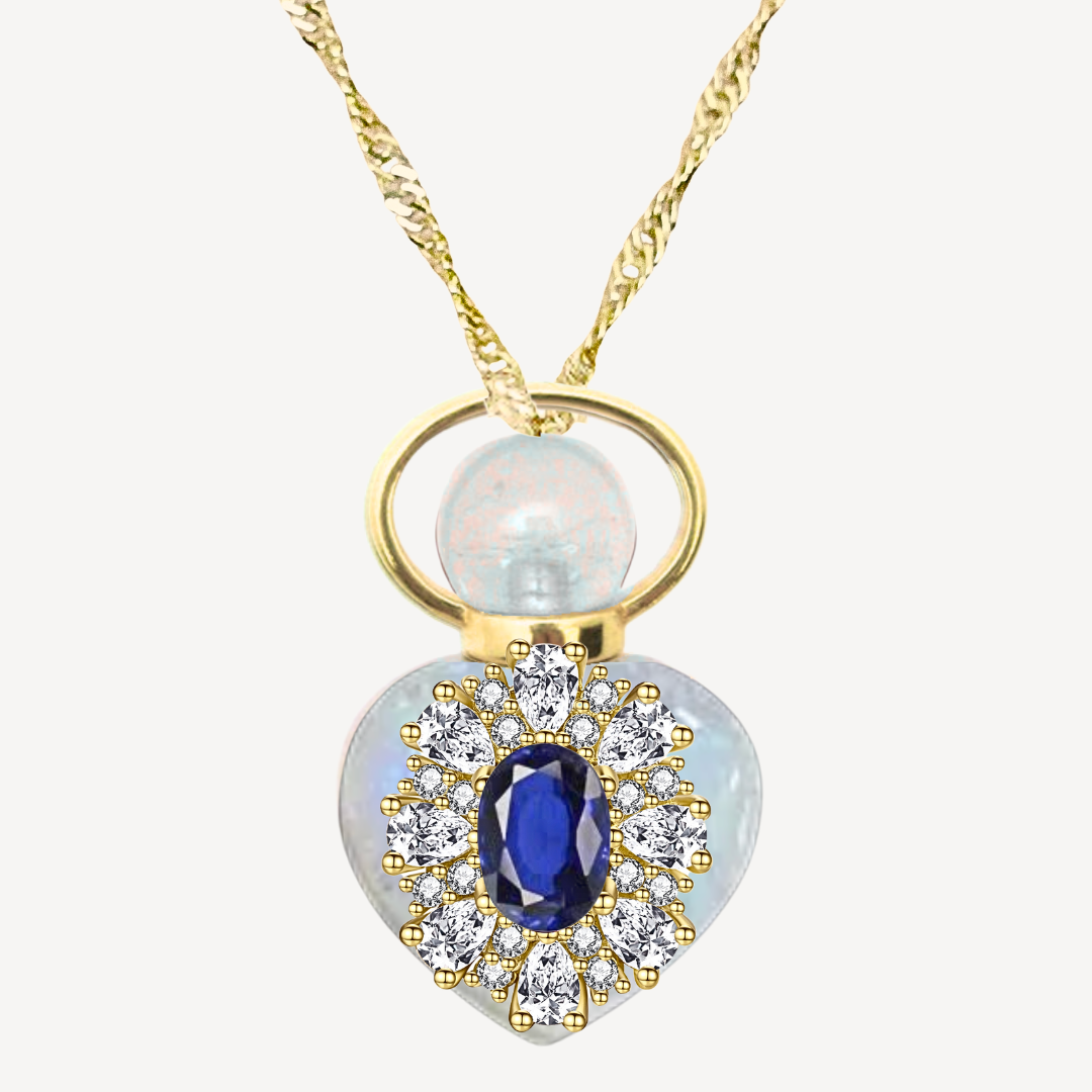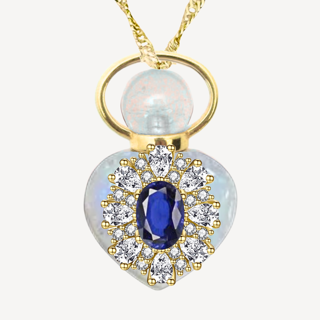 Cultivate courage and authenticity with our Blue Sapphire and Moonstone Perfume Amulet Pendant. Like Queen Rania, whose dedication to women’s rights and humanitarian work shines with valor and truth, you can live boldly. The Blue Sapphire inspires you to follow your dreams and stand up for what’s right. The Moonstone fosters deep self-acceptance, so you can always be authentic and stay true to your values.