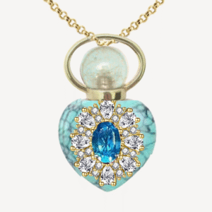Cultivate peace and illuminate your radiant spirit with our Turquoise and Blue Topaz Perfume Amulet Pendant. Inspired by Queen Marie of Romania, known for her humanitarian spirit and for treating people from all walks of life with equal respect, she advocated peace amidst the turmoil of war and shone with an unwavering inner light. You too can choose harmony and let your true self glow, becoming the center of peace amidst everyday business. The Turquoise inspires you to seek tranquility and foster unity, while the Blue Topaz helps you find your center, enveloping you in serene composure.
